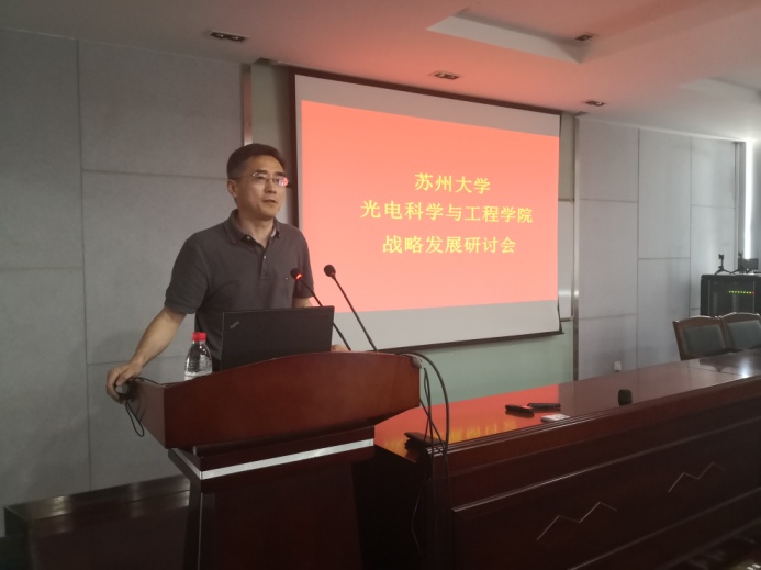 李孝峰院长代表学院作“光电科学与工程学院战略发展规划报告”。他回顾了学院沿革与学科、平台的建设过程,说明了学院人才引进与师资晋升情况,介绍说明了学院总体、场地与师资队伍等方面的现状,概述了学院教学、科研、学科建设与人才培养等方面的概况,总结了学院自成立以来的发展历程以及取得的突出成绩和宝贵经验,分析了学院在科研办学场所、本科人才培养基础、毕业生社会影响、教师队伍成长、科研团队规模、基础性研究水平与高层次人才培养能力等七个方面所面临的问题,结合学院下阶段发展的总体思想,归纳了在专业建设发展、青年师资培养、教学过程和学科布局等方面详实的发展规划。他希望与会人员以本次研讨会为契机——集思广益、建言献策,达成学院发展目标;同心协力,达成共识,绘就学院发展蓝图。