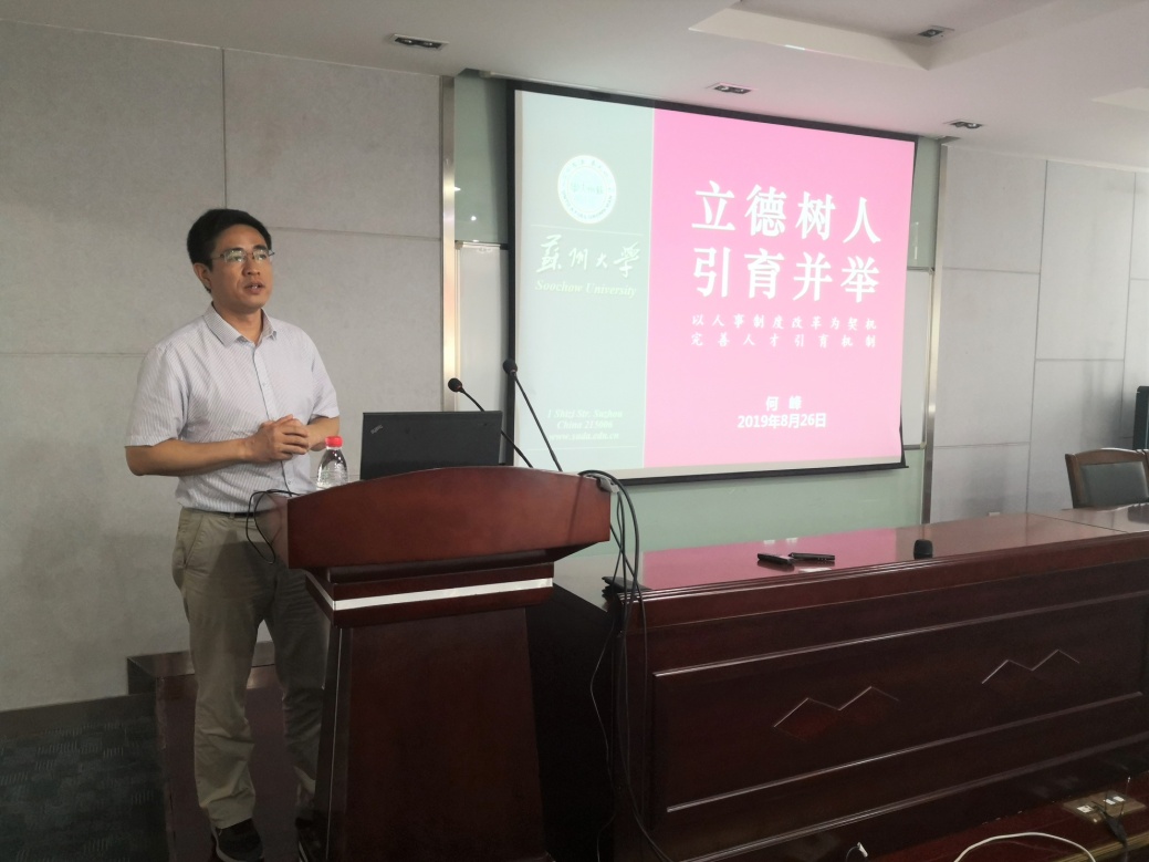 校党委教师工作部何峰部长作题为“立德树人,引育并举”的报告。他介绍了学校整体师资情况、师德建设的现状及人事制度改革的进展,鼓励光电学院依托学校精准引才、系统育才的人事制度,开拓国际化视野引进海外优秀人才,健全“大师+团队”的人才模式,将引人与育人相结合,做好人才引进与教师晋升的工作,平稳推进供给侧结构性改革、职员制改革、绩效分配等重大改革。