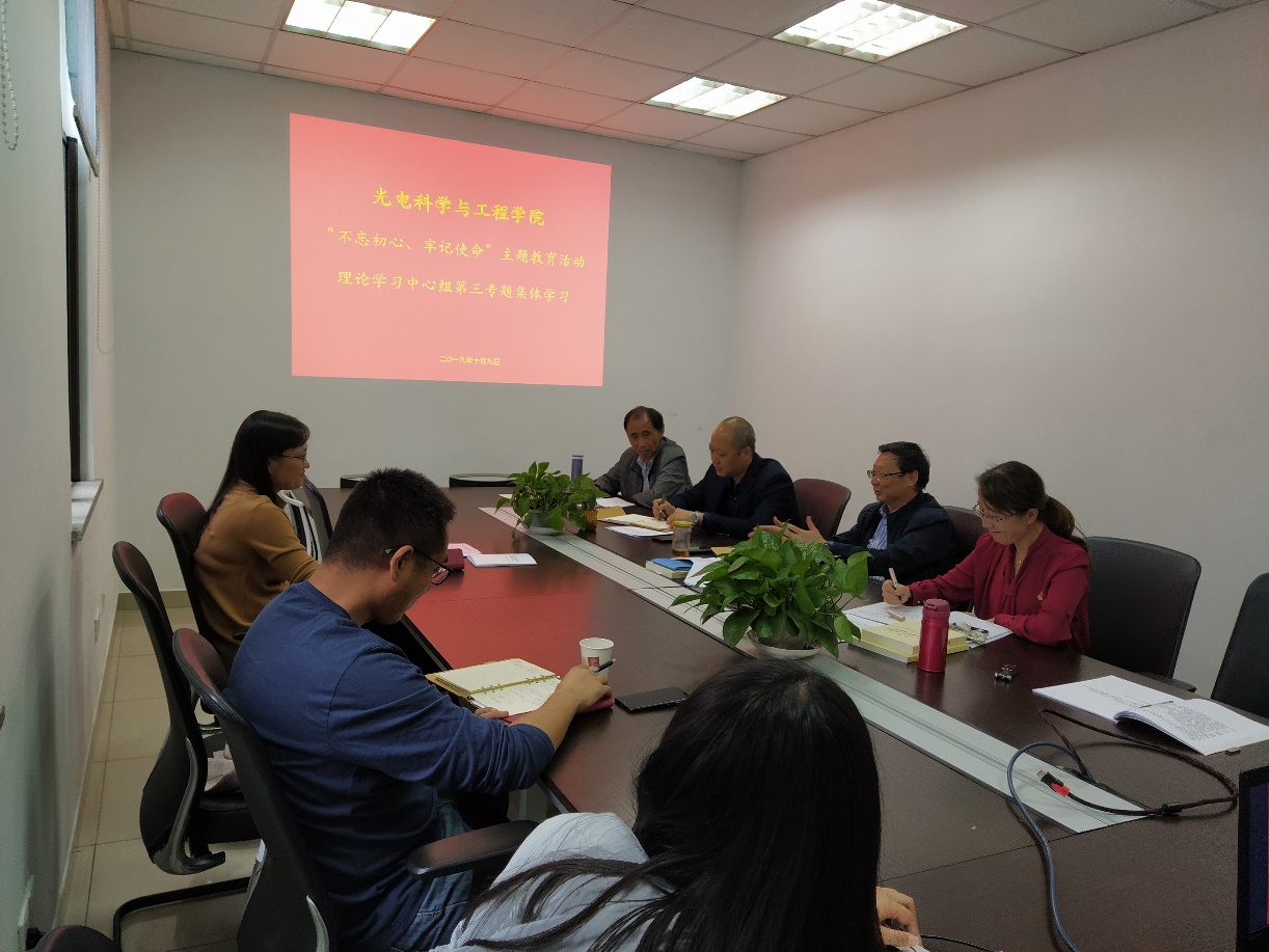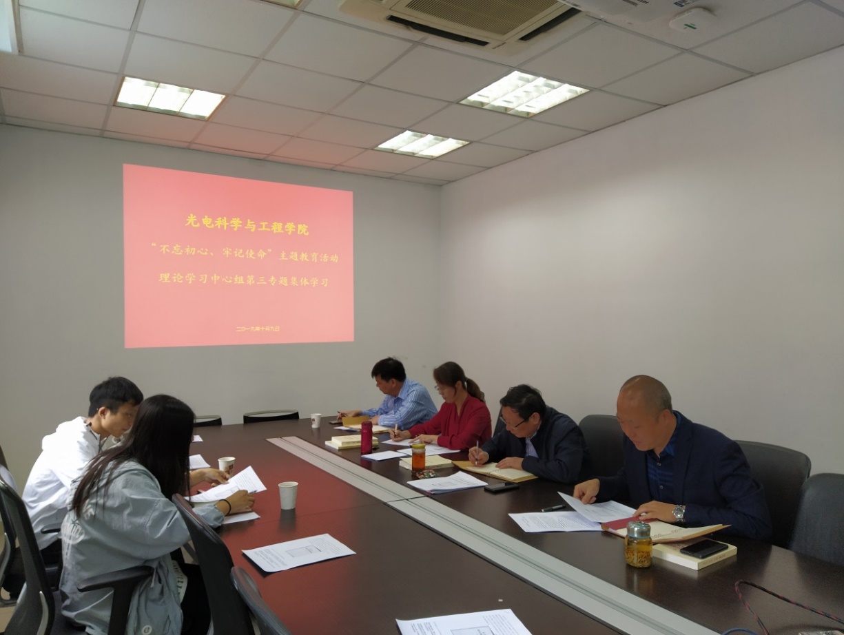 2019年10月9日,光电科学与工程学院党委理论学习中心组用时一天,开展了“不忘初心、牢记使命”主题教育第三专题集体学习研讨。第三专题的学习主题为“聚焦立德树人,提升人才培养质量”,学院教学副院长许宜申做主题发言,学院党政领导、党委委员、支部书记参加此次学习研讨并作交流发言。