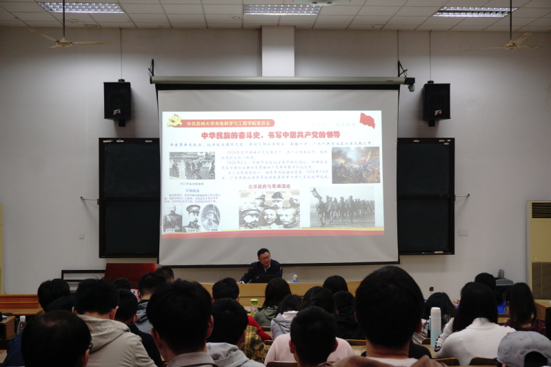 陈建军书记在党课中简明扼要地介绍了中国共产党的党史,向同学们展示了中国共产党带领中国一步步从被欺压瓜分到如今位列全球强国的历程。他强调,中国共产党的初心是“为中国人民谋幸福,中华民族谋复兴”。而作为新时代的新青年,同学们需要知道自己的初心、坚守自己的初心并为之不懈努力。谈及新时代对青年的要求时,陈书记介绍了光电学院优秀的科学报国人才,并通过潘院士的事例,教导同学们要学习身边的楷模,学习老一辈科学家的科学报国精神,努力成为中华民族复兴的中流砥柱。