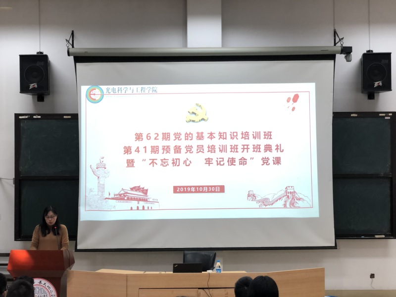 为端正入党积极分子和预备党员的入党动机,提高全体党员的党性修养,光电科学与工程学院于10月30日下午在现光所三楼举行分党校第六十二期党的基本知识培训班暨第四十一期预备党员培训班开班典礼,并邀请学院党委书记陈建军老师为全体学员作了“不忘初心、牢记使命”的主题党课。活动由学院党委副书记、副院长龚呈卉主持。