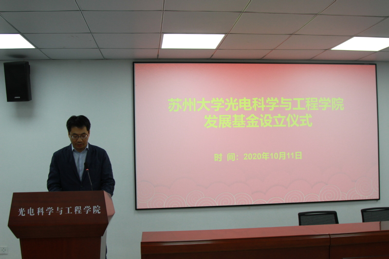 李孝峰首先宣读关于建立“苏州大学光电科学与工程学院发展基金”的启事,明确发展基金的设立目的及管理办法。王振明、陈洁作为捐赠人依次上台讲话,深切表达了对母校教育培养和关心关怀的感激,并希望通过校友捐赠的形式,用自己的行动为母校的发展建设贡献力量。