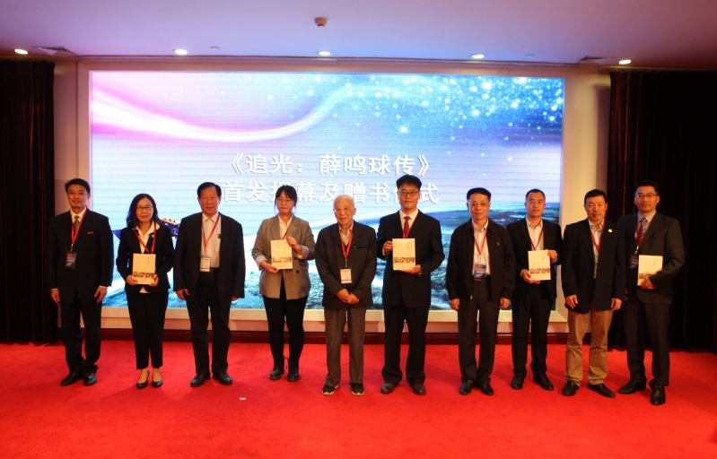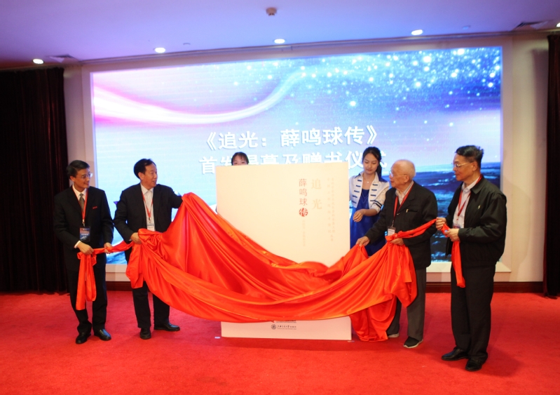 随后,潘君骅院士、庄松林院士、姜会林院士、邓敏副书记走上台前,共同为《追光:薛鸣球传》首发揭幕。中国光学学会秘书长、浙江大学刘旭教授与四位嘉宾一道,为薛院士曾经学习、工作过的单位代表赠书。
