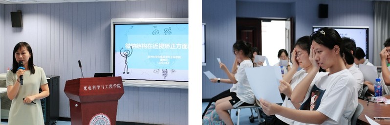 秦琳玲副教授的《微纳结构在近视矫正方面的应用》主题报告让同学们了解到我国青少年近视的严峻现状,学习了近视矫正的常用方法。报告最后,秦老师用我国眼视光领域杰出科学家、苏州苏大明世光学有限公司创始人余景池研究员的事迹做结尾,鼓励同学们胸怀祖国、严谨求实、淡泊名利,争做下一代科研接班人。