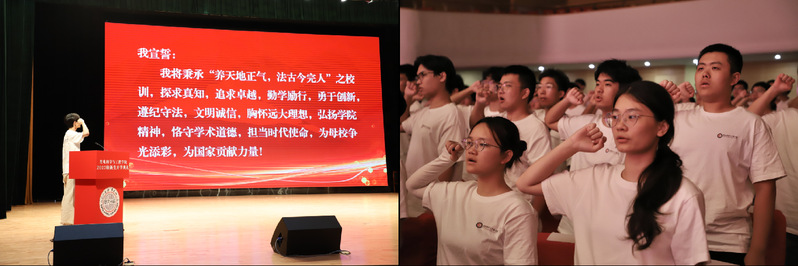 在最后的入学宣誓环节,全体新生起立,高举右拳,齐声宣读新生入学誓词。铿锵有力的誓言在会场回荡,不仅道出了他们对学术理想的坚守、对自我成长的期许,更表达了他们恪守校训、勇担使命、为祖国发展与科技进步贡献青春力量的决心。