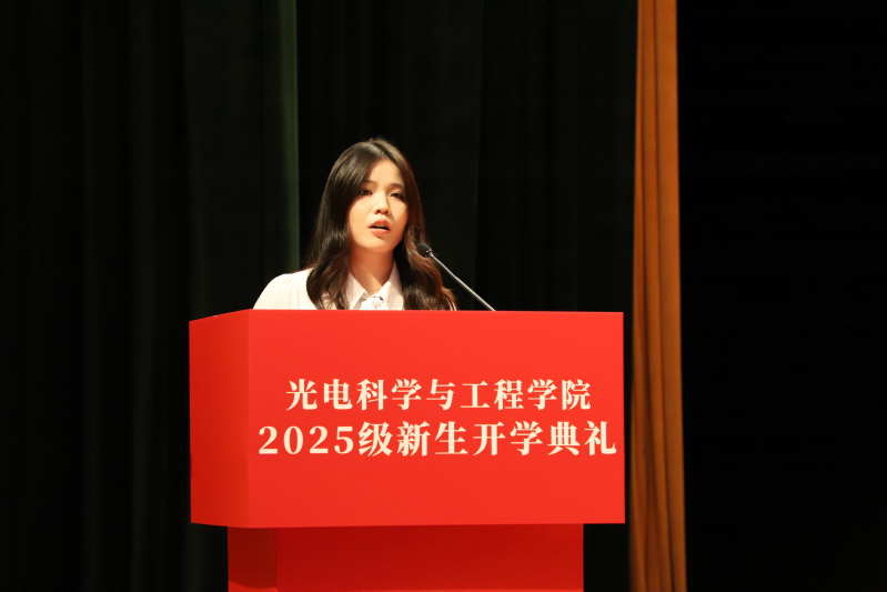 本科生老生代表,2022级本科生邵莉在发言中,寄语全体新生,希望大家以“博学之”的态度,筑牢专业根基;以“审问之”的勇气,探索创新边界;以“笃行之”的坚守,涵养家国情怀,鼓励学弟学妹在苏大光电的沃土中脚踏实地、乘风破浪,成长成才。