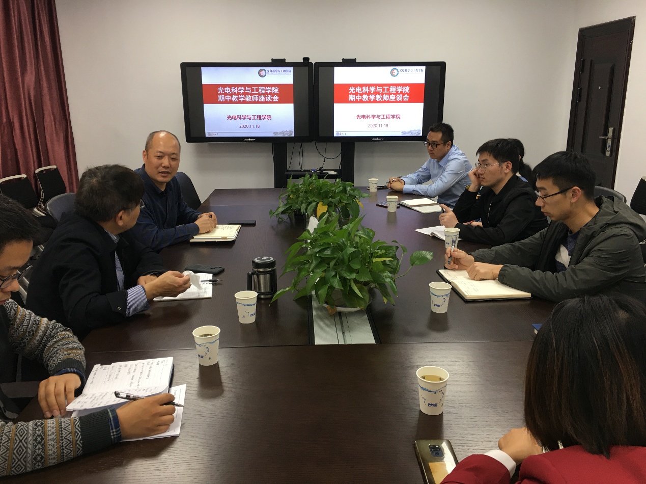 2020年11月18日下午14:30,学院在激光楼三楼311会议室召开了期中教学教师座谈会。校教学督导顾济华教授、光电信息系主任李念强、电子测控系主任黄敏、学院教师代表和教务办公室相关老师参加了座谈。会议由教学副院长许宜申主持。