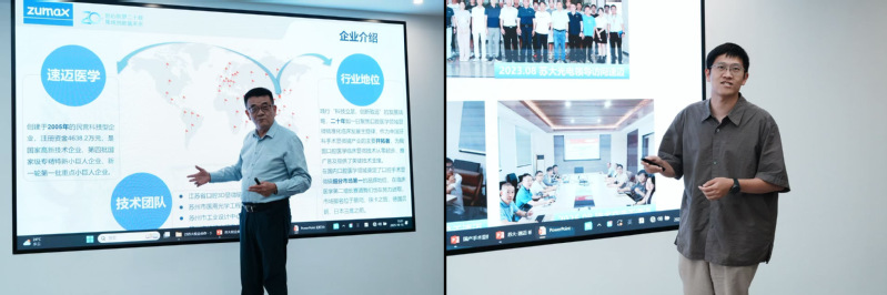 而后,光电科学与工程学院副教授朱嘉诚就双方前期合作项目进展与未来技术合作展望作交流。他回顾了前期在光学系统改造等方面取得的积极成果,并围绕图像融合技术、反射式光学系统、光谱技术、OCT技术等前沿方向,阐述了未来技术合作的广阔空间与具体路径。