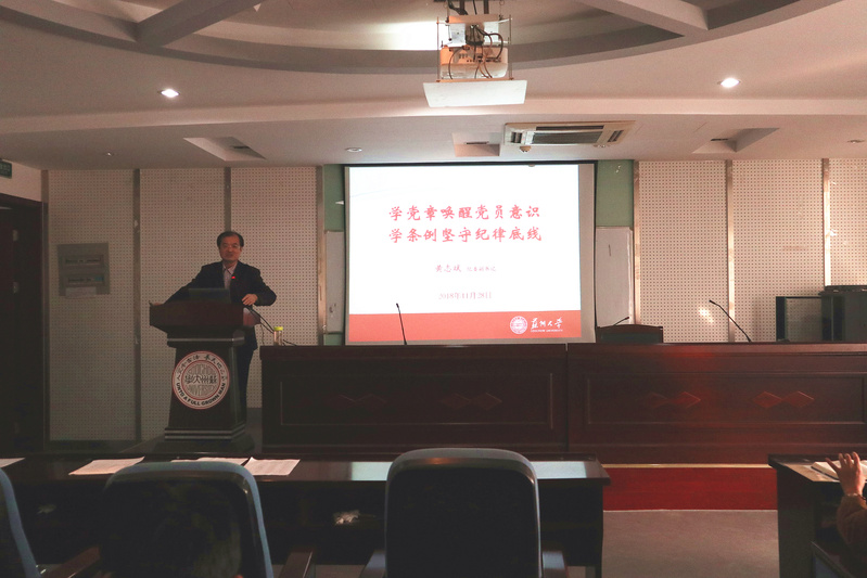 黄志斌书记通过“学党章唤醒党员意识”、“学条例坚守纪律底线”、“守纪律坚守底线 纪检监察远离你”等三个专题讲座,结合实际案例,详细解读了新修订的《中国共产党纪律处分条例》,并结合发生在学校的典型案例,作风建设自查自纠查出的问题以及校园微腐败整治等工作,对每一个党员同志提出了几点要求,要求全体党员树立作风建设永远在路上的观点;要强化作风无小事,反腐无盲区的理念;要恪守凡事按政策办,凡事按规矩走,凡事按制度来的纪律,严守党的政治、组织、廉洁、群众、工作、生活等各项纪律。最后,孙书记做了总结发言,感谢黄书记给学院党员同志做的精彩报告,同时要求学院每一个党员要提高思想认识,增强学习贯彻的自觉性和坚定性,严格按照《条例》强化纪律约束,筑牢思想防线;要深入学习领会,坚持把学习领会《条例》作为当前一项重要政治任务抓紧抓实,自觉把讲政治、懂规矩、守纪律作为我们的正身之本,政治上讲忠诚、组织上讲服从、行动上讲纪律;要强化贯彻执行,坚持高标准、严要求,真正让制度、纪律成为带电的“高压线”, 严守政治纪律、组织纪律、工作纪律、廉政纪律,严格以铁的纪律来规范言行。牢记立德树人使命,用实际行动回答习近平总书记提出的“为谁培养人,培养什么样的人,怎样培养人的”问题。