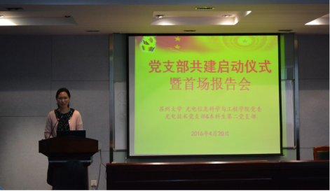 2016年4月20日下午,光电信息科学与工程学院光电技术党支部与本科生第二党支部共建启动仪式暨首场报告会在物理科技楼101举办。光电信息科学与工程学院党委书记孙德芬、光电技术党支部书记许宜申副教授、两个党支部的部分师生等参加了本次活动。报告会由物理与光电·能源学部党工委副书记、本科生第二党支部书记沙丹丹主持。