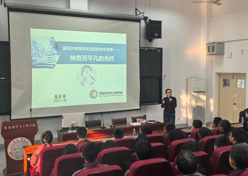 随后,学院副教授张桂菊带来了主题为《诺贝尔物理学奖背后的光学故事——神奇而平凡的光纤》的科普讲座。张老师以生动的语言和丰富的案例,从光纤的基本原理入手,深入浅出地讲解了光的全反射应用以及光纤对信息传递方式的改变。她结合诺贝尔物理学奖相关成果,剖析了科学家们在科学探索过程中的不懈努力与创新思维,引导学生们感受科学研究的艰辛与乐趣。学生们围绕日常生活中的光学现象、光纤通信的未来发展等问题展开热烈讨论,现场气氛活跃。