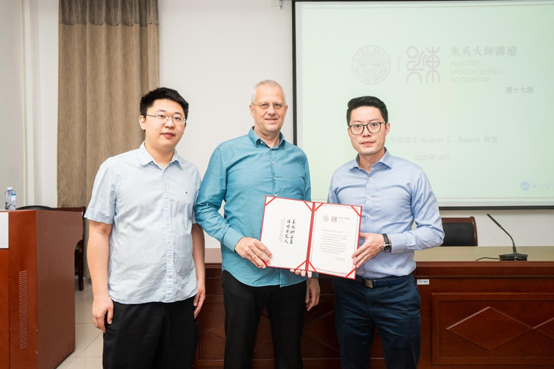 我院副院长陈煜代表学校,向Rogach教授颁发“东吴大师讲坛”纪念证书。