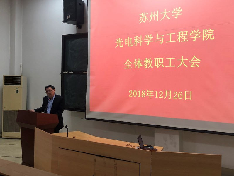 接下来陈建军书记对2018年度光电科学与工程学院教职工师德考核和年度考核工作进行了部署安排。要求各考核对象对照考核文件要求,认真撰写年度总结,填写考核登记表。各小组严格按照相关文件规定,及时完成考核任务。李孝峰院长就2019年自然基金申报工作做了进一步动员。许宜申副院长强调了期末考试相关安排及注意事项。