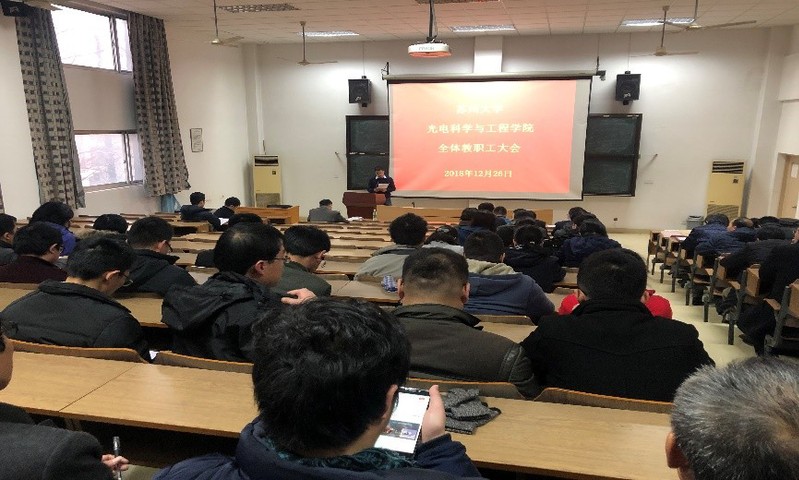 2018年12月26日下午1:30分,光电学院在现代光学技术研究所三楼阶梯教室召开全体教职工大会,进行学院学期工作总结,开展学院领导班子及领导干部个人民主测评与考核,学院全体教职工参加会议。