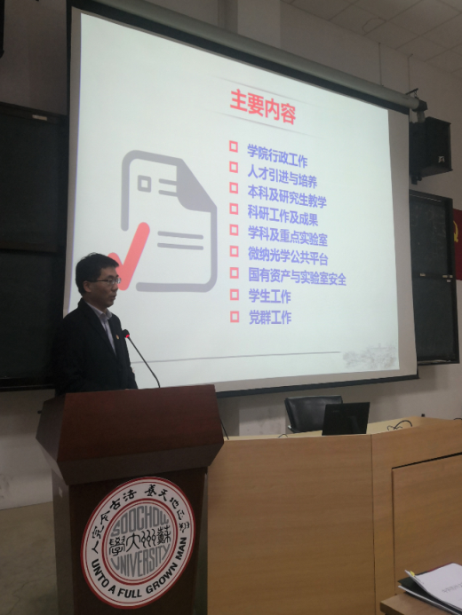 李孝峰院长首先就学院2019年度的工作进行了总结汇报。向全院教职工介绍了学院在行政事务、人才引进与培养、本科及研究生教学、科研工作及成果、学科及重点实验室、微纳光学公共平台、国有资产与实验室安全、学生工作、党群工作等各方面的开展情况与所获成绩,充分肯定了学院在过去一年获得的成果,梳理了学院工作中存在的不足,感谢全院教职工的尽职尽责与辛勤付出,激励教职工们增强责任感、提升紧迫感、明确自身定位、提升个人目标,以崭新的姿态迎接教学、科研、行政等方面的新挑战,推动学院的全面发展。
