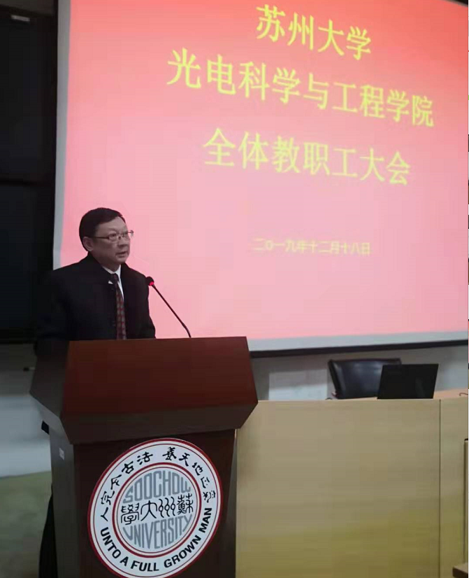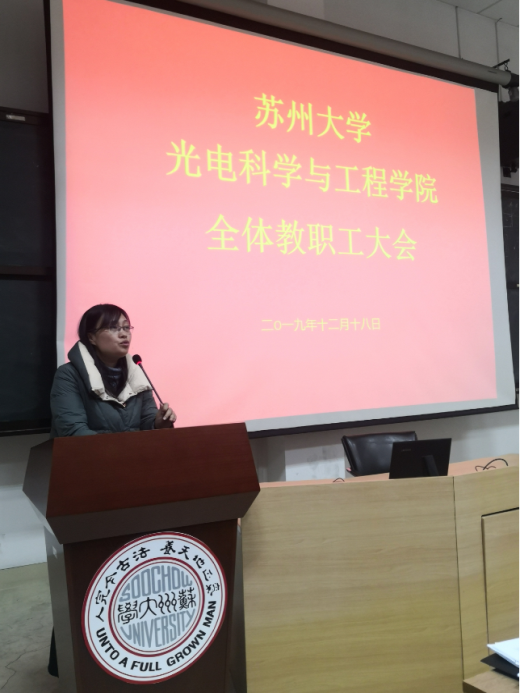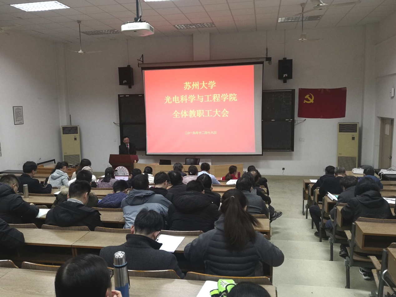 2019年12月18日下午,光电科学与工程学院在现代光学技术研究所阶梯教室召开全院教职工大会,学院全体教职工参加会议。会议由学院党委书记陈建军主持。