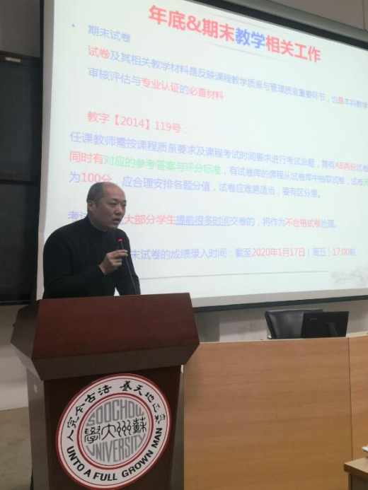 许宜申副院长围绕教学工作方面的内容及要求进行了补充与布置。要求全体教师在期末着力做好教学业绩点核算、出卷阅卷、期末监考等工作,汇总并剖析了对先前试卷与毕业论文进行统一检查后发现的问题,希望教师增强责任心,在教学工作中注意对标对表,进一步提升工作责任心与教学工作质量,并对各位老师在教学事业中的辛苦付出表示感谢。
