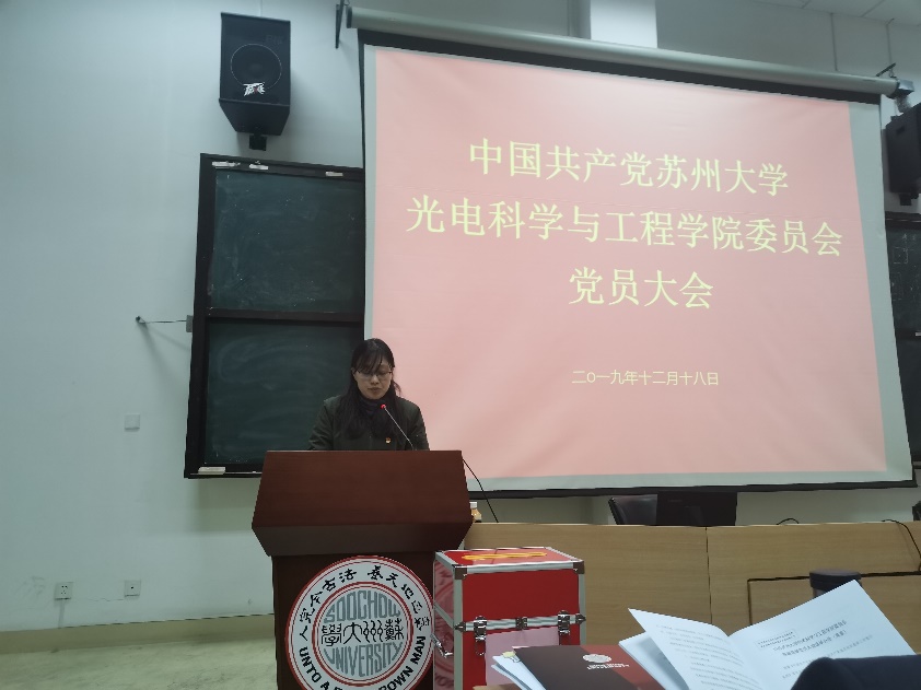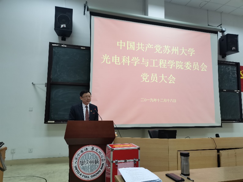 下午一点半,党员大会在雄壮的国歌声中开幕。陈建军同志代表本届党委作了题为《以党建引领改革,以创新驱动发展,为建设国内一流、国际知名的光电学院而努力奋斗》的党委工作报告,就学院过去四年在党的建设、师资队伍建设、人才培养、科学研究、学科发展等方面的工作做了全面回顾与总结,在肯定所取得成绩的同时,也就存在问题提出了今后的工作目标和主要任务。