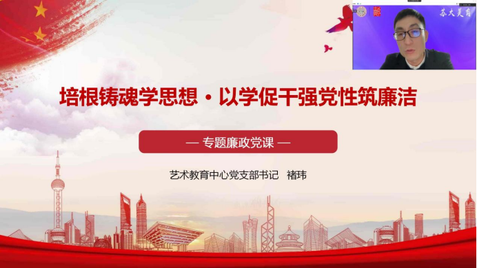 艺术教育中心党支部书记褚玮通过线上讲授“培根铸魂学思想·以学促干强党性筑廉洁”专题廉政党课。他提出各位党员要深入学习领会习近平新时代中国特色社会主义思想的精神实质和丰富内涵,抓方向、抓要点,清晰敏捷地在党风廉政的学习过程中深入思考,精准把握廉洁自律准则。要立足于习近平新时代中国特色社会主义思想,将党的廉政准则贯穿于实践行动中,以学铸魂、以学增智、以学正风、以学促干。要围绕党的二十大报告中提出的新思想、新论断、新提法、新举措,加深党建廉政意识武装头脑,用小切口呈现大话题,用小故事折射大时代。