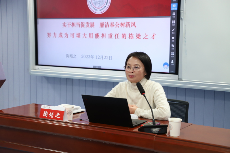校纪委副书记陶培之以《实干担当促发展,廉洁奉公树新风,努力成为可堪大用能担重任的栋梁之材》为题作专题报告。陶书记以习近平总书记2023年12月在广西考察时的发言为引入,围绕学校纪委监察部门职责、工作中的纪法知识、增强党组织政治功能和组织功能三个方面入手,由浅入深地为与会师生解读了学校纪检监察部门的职责内涵。同时以案为鉴,为全体师生讲解了发生在大家周围的违反党风廉政底线的警示案例,通过《中国共产党党内监督条例》《政务处分法》等规定的细则列举,强化警示教育,进一步教育引导广大党员干部树牢纪法意识,恪守廉洁自律,坚持不懈用习近平新时代中国特色社会主义思想凝心铸魂,不断巩固风清气正的政治生态。报告最后,陶书记表示,全体党员要进一步提高政治站位,清白做人,干净做事,时刻保持清醒头脑和警惕,做“讲纪律、知敬畏、重修养、守底线”的好老师和“忠诚、干净、担当”的好党员。