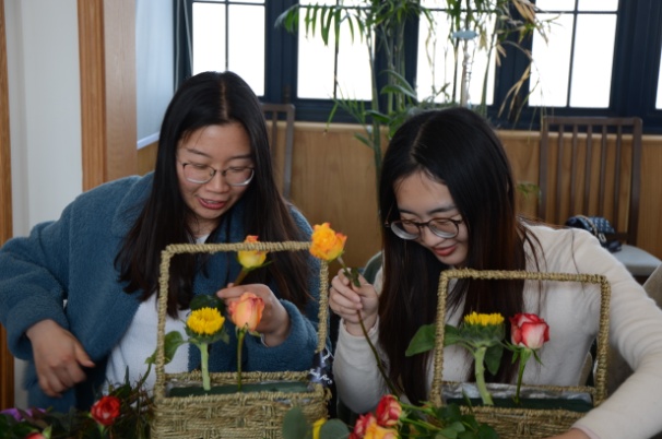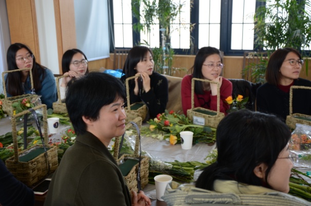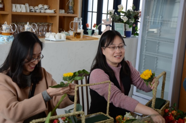 活动的实践环节,活动参与者既遵循教师的指导,又发挥自己的想象力和创造力,把各种花叶搭配组合。大家一边创作一边讨论,现场洋溢着欢声笑语。经过两个小时的活动,女教职工们纷纷完成了各自作品。