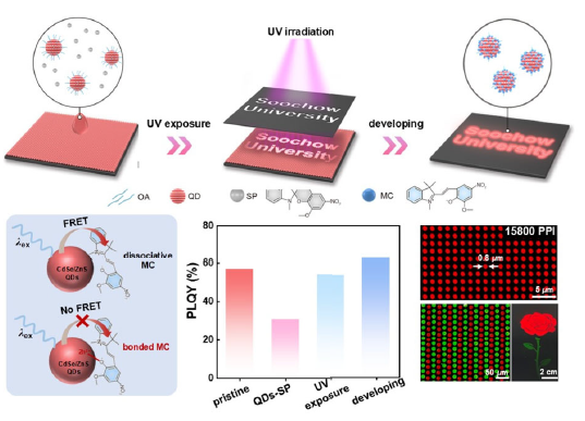 直接光图案化为下一代显示器的高分辨率量子点图案提供了一种直接的方法。然而,由于量子点表面态和/或周围环境的变化导致其光学性能普遍恶化,这严重限制了高品质量子点图案和高效电致发光器件的获得。在此,陈煜、任振伟、罗成招等人提出了一种巧妙且有效的方法,利用螺吡喃到部花青的光致异构转变来制备高发射性的量子点图案。揭示了抑制量子点与游离部花青之间的非辐射能量转移是实现发光快速恢复的关键。实现了小尺寸(0.8 μm)、高分辨率(15,800 PPI)、高保真度(~100%)、多色且精细化的量子点像素,并展示了该方法在CdSe/ZnS和钙钛矿量子点像素制备中的良好兼容性,以及在刚性及柔性衬底上的适用性。这些优点促进了高性能像素化器件的发展,在6350 PPI分辨率下实现了高达35,534 cd m⁻²的亮度和24.5%的创纪录效率,这是在直接光图案化器件中的最佳表现。此外,验证了所提出策略在高性能像素化钙钛矿器件中的广泛适用性,在1760 PPI分辨率下实现了13.8%的效率。上述结果证实了该方法在制备高质量量子点图案和高性能像素化器件方面的重要价值。