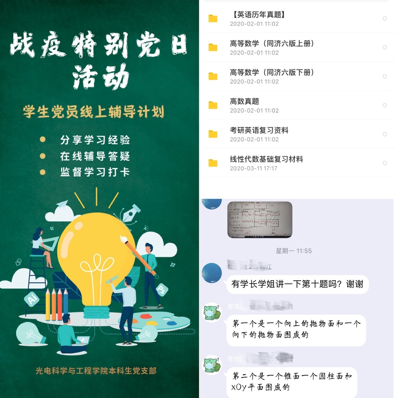 面对“停课不停学”的要求,本科生党支部还组织党员们倾情推出“线上辅导计划”,针对不同年级的同学开展分类辅导。部分党员结合自身备考情况为大三考研同学们精心整理了一份复习资料,并不定期分享考研经验;另一部分党员则针对大一新生进行线上数学答疑,帮助低年级中数学基础较为薄弱的同学巩固知识点,完善数学学习方法,充分发挥出学生党员的朋辈作用。
