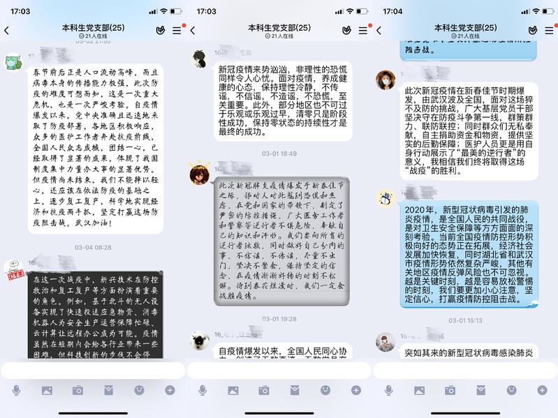 线上学习环节,支部书记姚亦洁带领全体党员认真学习了“习近平总书记在统筹推进新冠肺炎疫情防控和经济社会发展工作部署会议上的讲话”内容,并鼓励党员们充分运用学习强国、微信公众号等网络平台,主动搜集关于防疫抗疫的权威信息、科学防护知识、涌现出的先进事迹等,在支部群内相互学习交流,积极分享自己对此次防疫阻击战的体会和感悟。为进一步做好线上防疫宣传,全体党员依托“江苏高校疫情防控培训网”持续深入学习,并结合所掌握的防疫知识建立起学院疫情防控知识答题库,鼓励院内同学们积极参与到专题知识竞赛活动中,检验自己对防疫知识的掌握情况。
