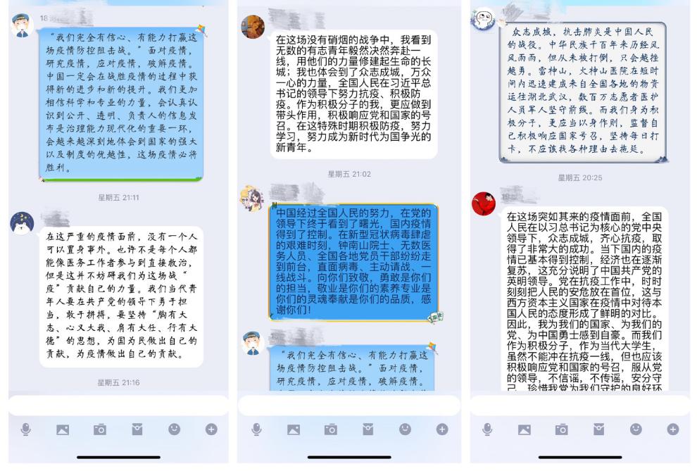党课结束后,各学生党支部分别组织开展了线上“云讨论”活动。各位党员和入党积极分子结合此次党课学习的内容,积极分享了自己对当前疫情防控工作的思考。同学们在讨论过程中相互碰撞思想火花,更加充分地认识了在新时代新要求下当代青年大学生所承担的责任,也更加明确了自己今后努力和前进的方向。