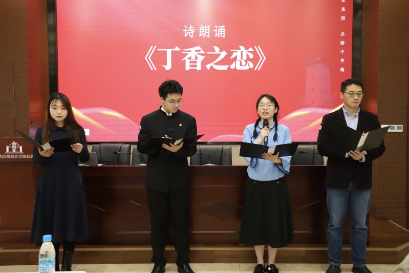 党委组织部副部长程晓军等4名师生党员代表共同演绎了诗朗诵《丁香之恋》,以苏州大学校友丁香英烈的真实故事为纲,带领全体党员学习峥嵘校史、党史,践行苏州大学“养天地正气,法古今完人”的校训精神,致敬英烈。在场党员师生无不沉浸在肃穆庄严的氛围中,深刻感悟丁香精神。