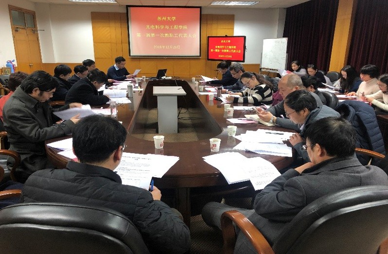 2018年12月26日上午10点,在现代光学技术研究所三楼会议室召开光电科学与工程学院第一届第一次教职工代表大会。学院全体教代会代表参加了会议。会议由陈建军书记主持。