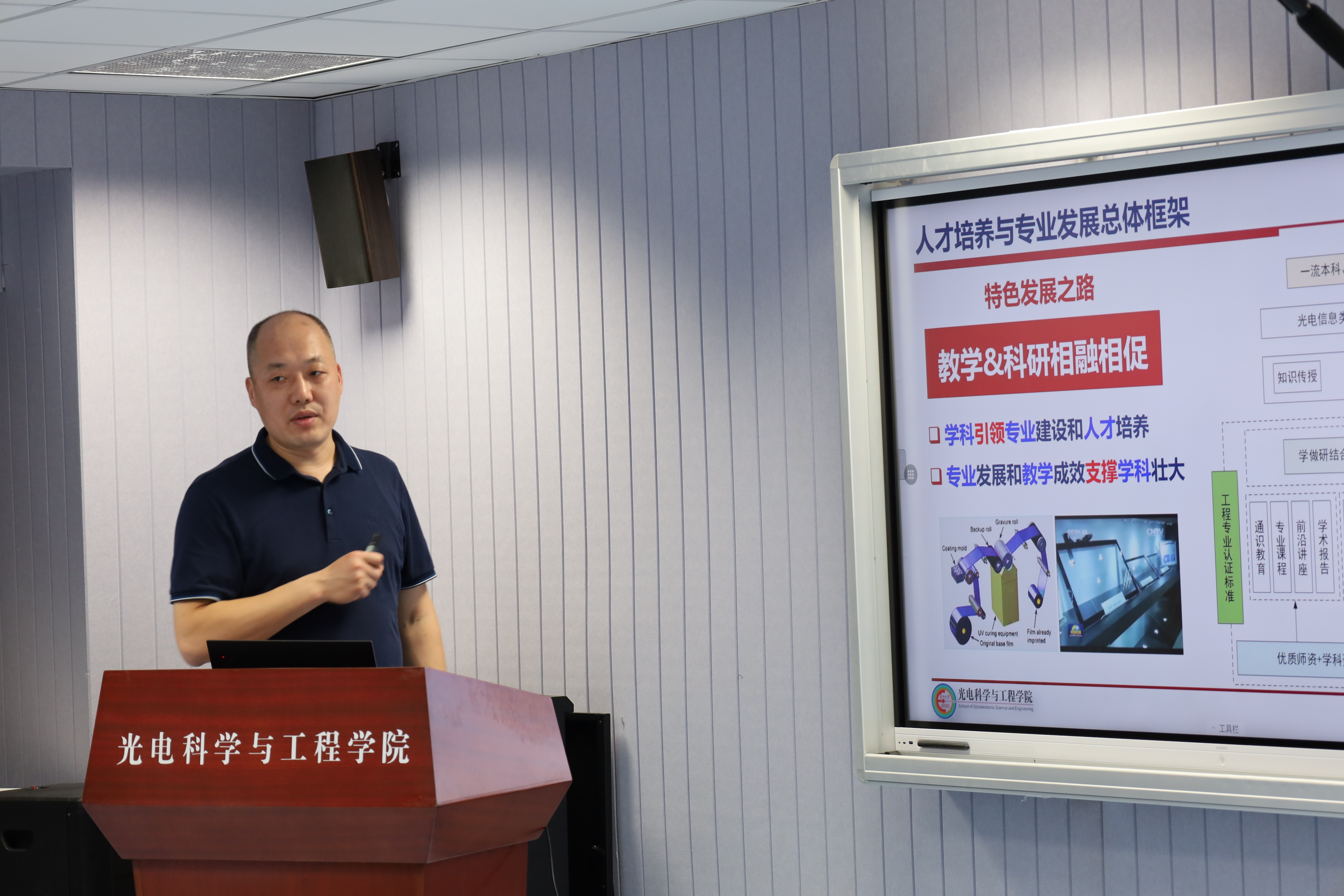 教务处方亮处长在讲话中强调本科专业建设始终是人才培养的重中之重,教务处鼎力支持学院做好人才培养和专业建设工作。同时,对学院本科专业建设发展提出了四点建议和期望:一是依托学科优势和优质资源,深入推进并不断优化产教融合,扎实做好体现光电特色的人才培养模式改革和专业内涵建设;二是做好课程体系优化和专业核心课程建设,以多门一流课程有效支撑一流专业建设;三是打造高水平教学团队,重视教学交流和青年教师业务能力培养,不断提升专业教师教育教学水平,充分保障课堂教学质量;四是加强学生思想道德建设和人才培养中的价值引领,充分发挥课堂主阵地作用和教师潜移默化影响力,培养真正对社会有用的卓越人才。