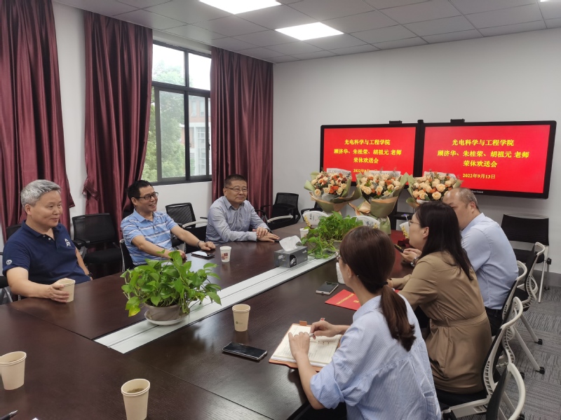 9月13日下午,光电科学与工程学院为2022年度退休的教职工举行荣休欢送会。学院2022年退休教职工顾济华、朱桂荣、胡祖元等三位老师,学院党委书记龚呈卉、副院长许宜申、副院长曲宏出席荣休欢送会,学院综合办公室主任、分工会主席参加活动。