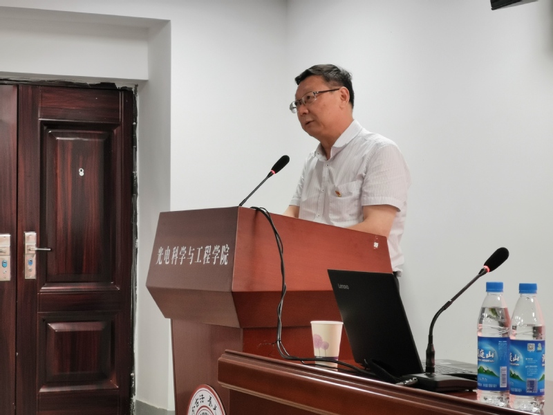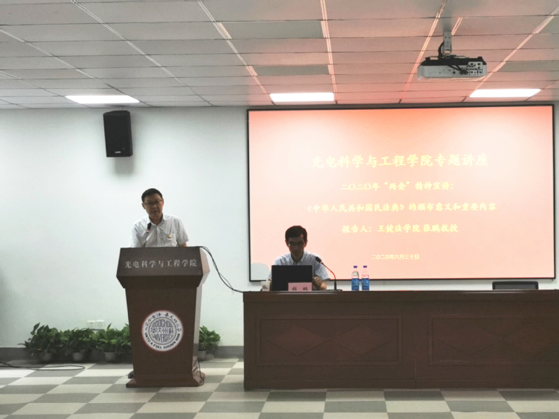 在庆祝建党99周年之际,6月30日下午,我院在激光楼多功能厅召开了学院党委理论学习中心组(扩大)学习会,邀请王健法学院张鹏教授做民法典专题辅导报告,并进行了党委理论学习中心组第五、六专题的集中学习。学院领导、党委委员、全体支部委员及系主任参加了本次学习会。会议由学院党委书记陈建军主持。