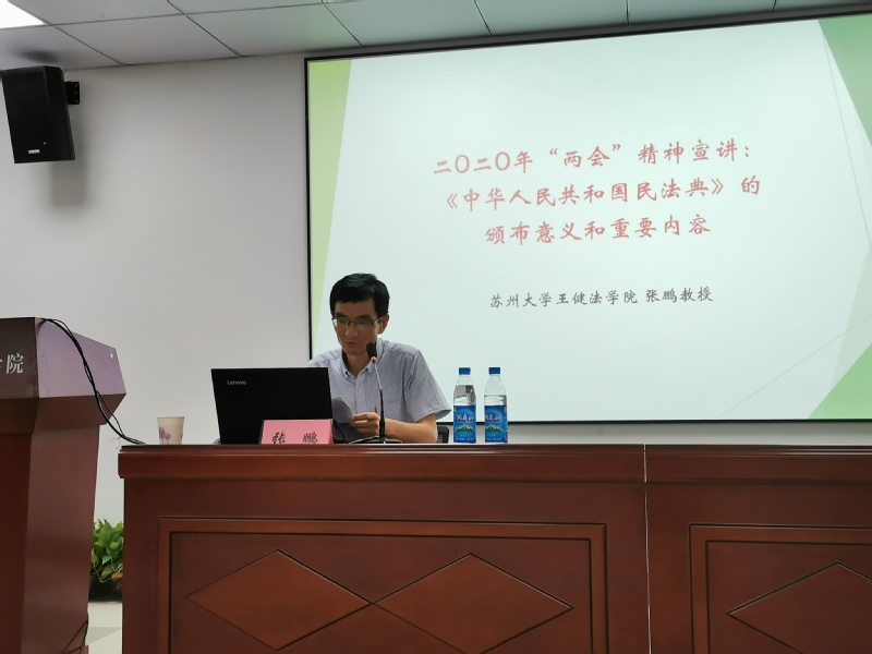 张鹏教授做了题为《二O二O年两会精神宣讲:<中华人民共和国民法典>的颁布意义和重要内容》的专题报告。他从法律的基本涵义出发,引导在座各位逐步了解《中华人民共和国民法典》的内涵及重大意义,并回顾了《中华人民共和国民法典》的制定过程和框架结构。他重点就大家社会生活中比较熟悉和重要的热点难点问题从《中华人民共和国民法典》的角度进行了解读,包括:住宅建设用地使用权期满续期问题、死者人格保护、协议离婚冷静期问题、夫妻共同债务的认定、过错责任问题、公平责任问题以及高空抛掷物致人损害问题等。在用时1个半小时的专题讲座中,张鹏教授用幽默风趣的语言,通过一个个具体问题的分析和解读,既为大家普及了法律知识,又让大家具体地、深入地了解了《中华人民共和国民法典》对维护人民权益、促进经济发展和推进全面依法治国所产生的重大影响。