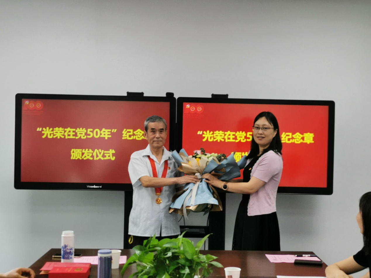 一百年浩浩荡荡,五十年不改初心。在中国共产党成立100周年之际,党中央启动了“光荣在党50年”纪念章颁发工作,我院姜亚光和张耀明两位老党员获此殊荣。6月28日上午,学院党委在激光楼311会议室举行了简朴庄重的“光荣在党50年”纪念章颁发仪式,为我院党龄满50周年的老党员颁发纪念章。张耀明作为老党员代表出席了颁发仪式。学院党委书记龚呈卉首先向我院老党员致以崇高敬意和诚挚问候,并向张耀明颁发“光荣在党50年”纪念章。