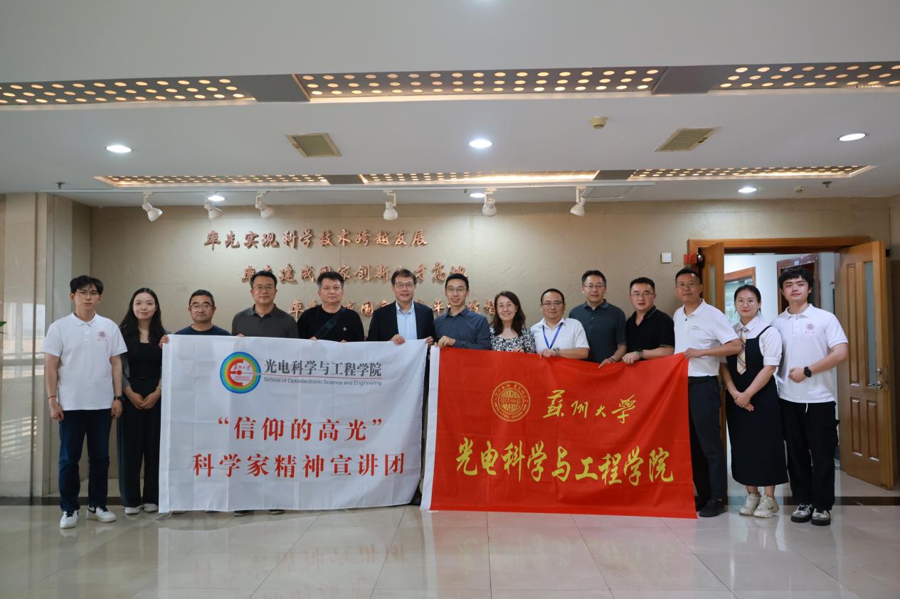在中国科学院长春光机所,学院师生党员们就“科学家精神”为主题,与长光所开展专题座谈会,中国工程院院士、中国科学院长春光机所所长张学军,长春光机所光学中心主任张舸,长春光机所质检中心主任韩冰出席会议。会上,副院长王长擂为长春光机所介绍了苏州大学光电科学与工程学院的历史沿革、科研平台建设、产学研拓展、人才培养模式以及科学家精神培育引导工作等,张学军所长高度肯定了学院在服务国家战略及地方经济发展上的贡献,并表示希望双方后续能够在光电领域持续加强沟通交流,强化资源融通,共同弘扬科学家精神,探索科技创新合作路径。