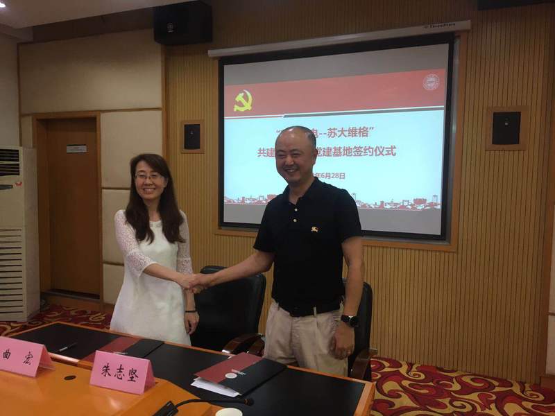 为深入学习贯彻党的十九大精神,进一步落实新时代党建工作的新要求,拓展校企合作新领域,6月28日下午,“苏大光电—苏大维格”共建校企协同党建基地签约仪式在红楼会议中心201会议室举行。苏大维格光电科技股份有限公司集团总裁朱志坚、部长刘为俊、副部长刘晓宁、研发工程师罗明辉、支部工作人员樊美娟,苏州大学党委组织部副部长刘慧、光电科学与工程学院党委书记陈建军、党委副书记兼副院长龚呈卉、副教授乔文、学科办主任张玉安、工程师王伟出席本次仪式,仪式由学院副院长曲宏主持。