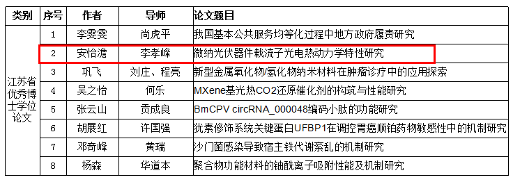 根据江苏省优秀学位论文评选工作通知要求,经学校初评推荐、各教指委专家复评、综合专家组综合评议以及专家委员会审定,近日2022年江苏省优秀博士硕士学位论文名单已最终确定。根据《江苏省学位委员会 江苏省教育厅 关于公布2022年江苏省优秀博士硕士学位论文评选结果的通知》(苏学位字函〔2022〕8号),2022年度共评选出江苏省优秀博士学位论文100篇,其中我校获评8篇,我院李孝峰教授指导的安怡澹博士的学位论文《微纳光伏器件载流子光电热动力学特性研究》位列其中。